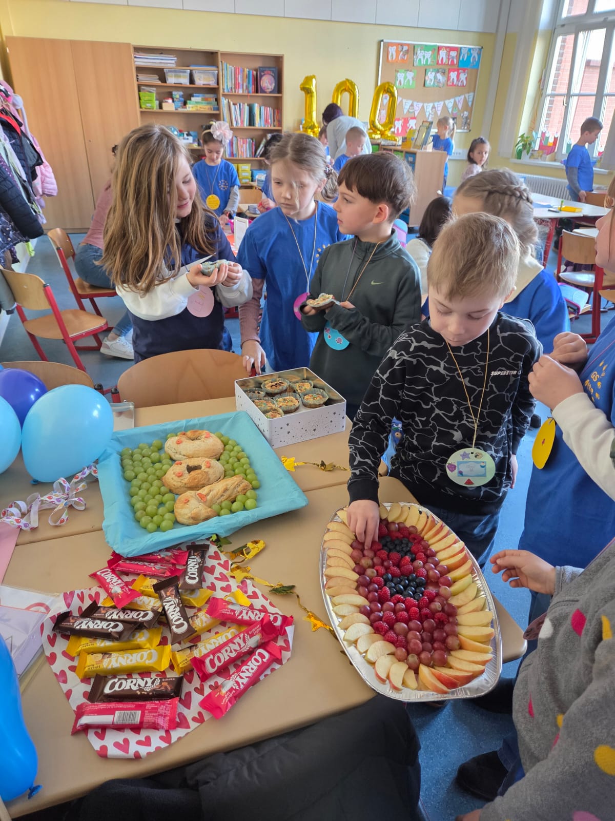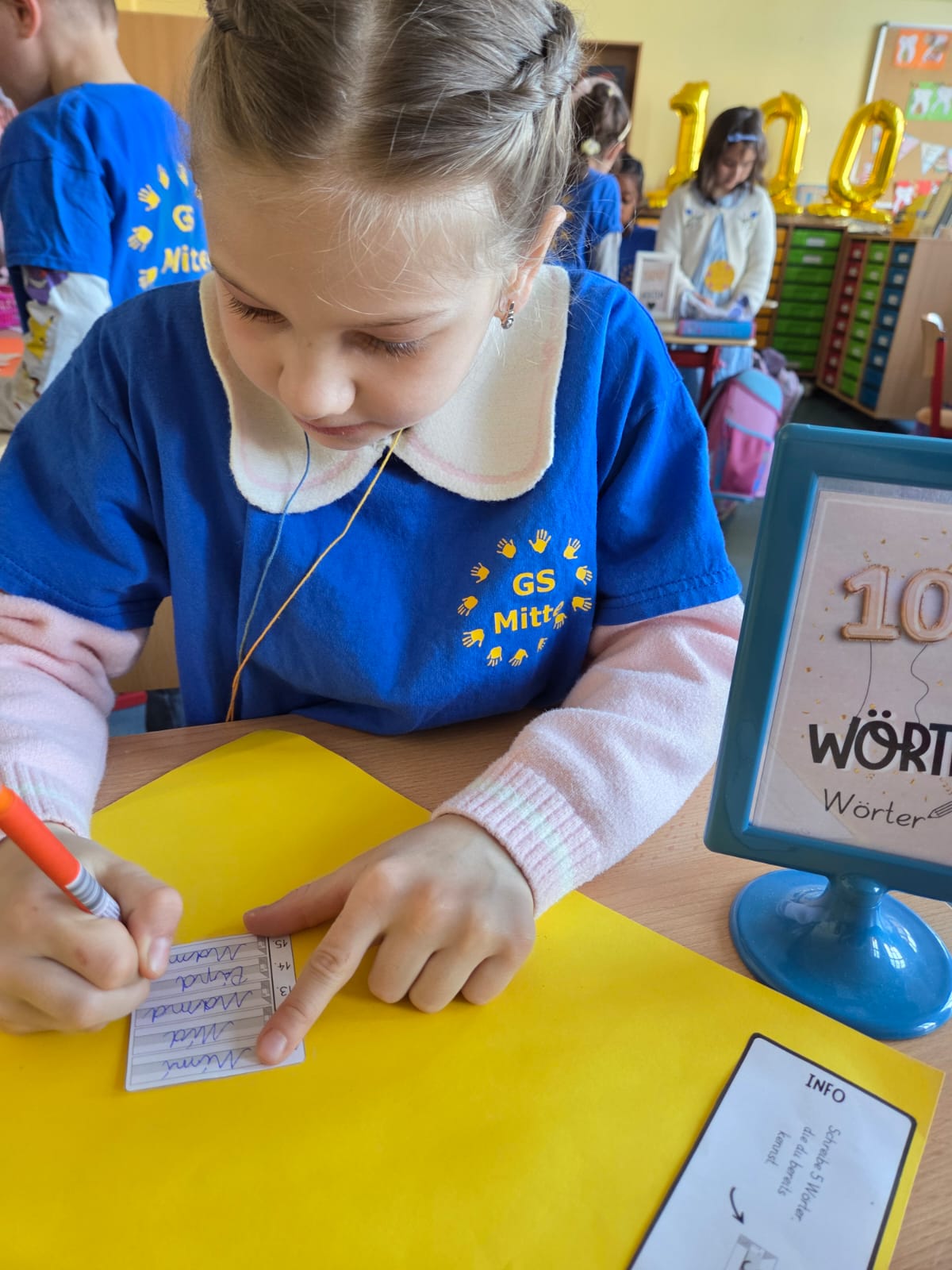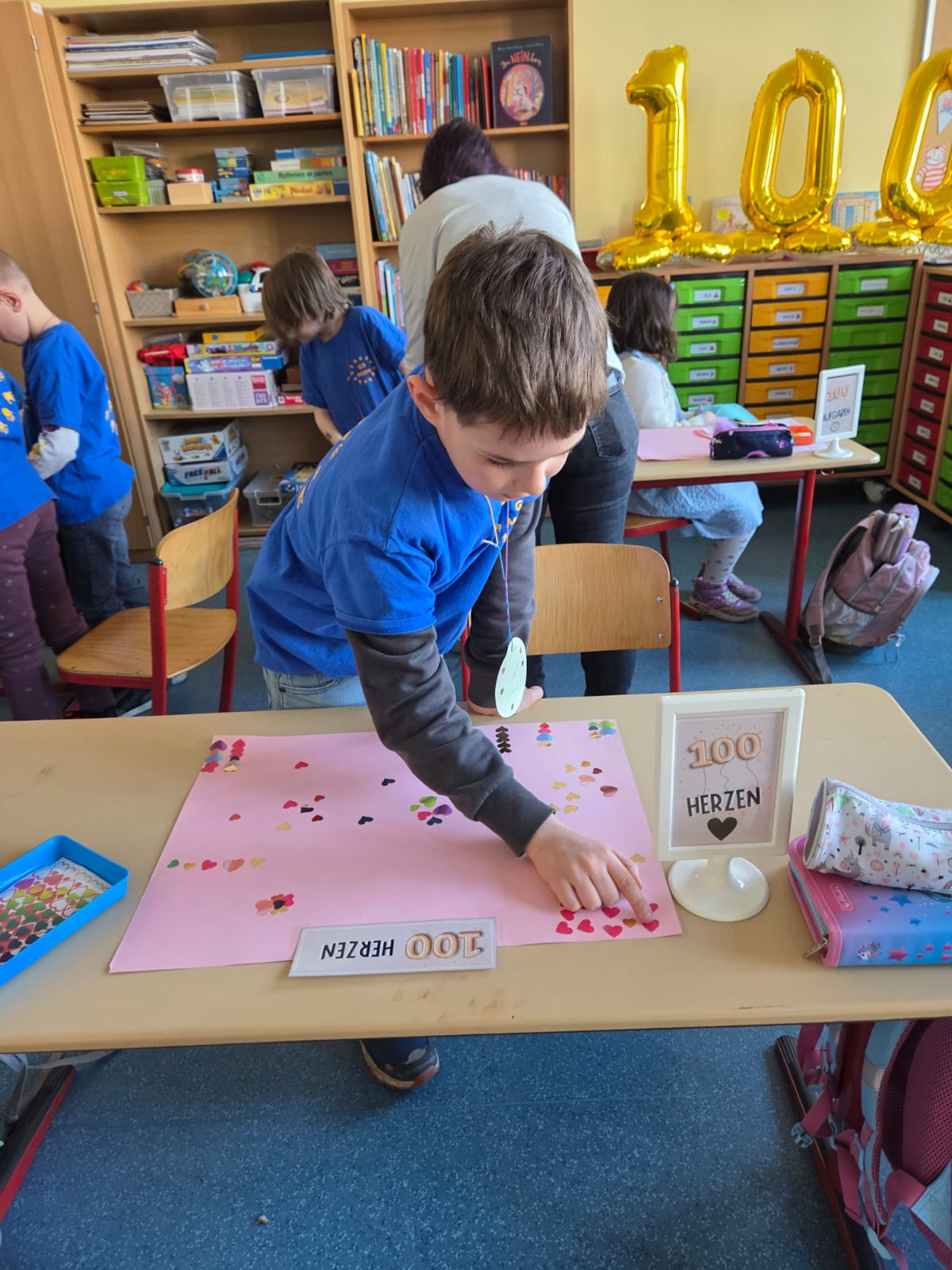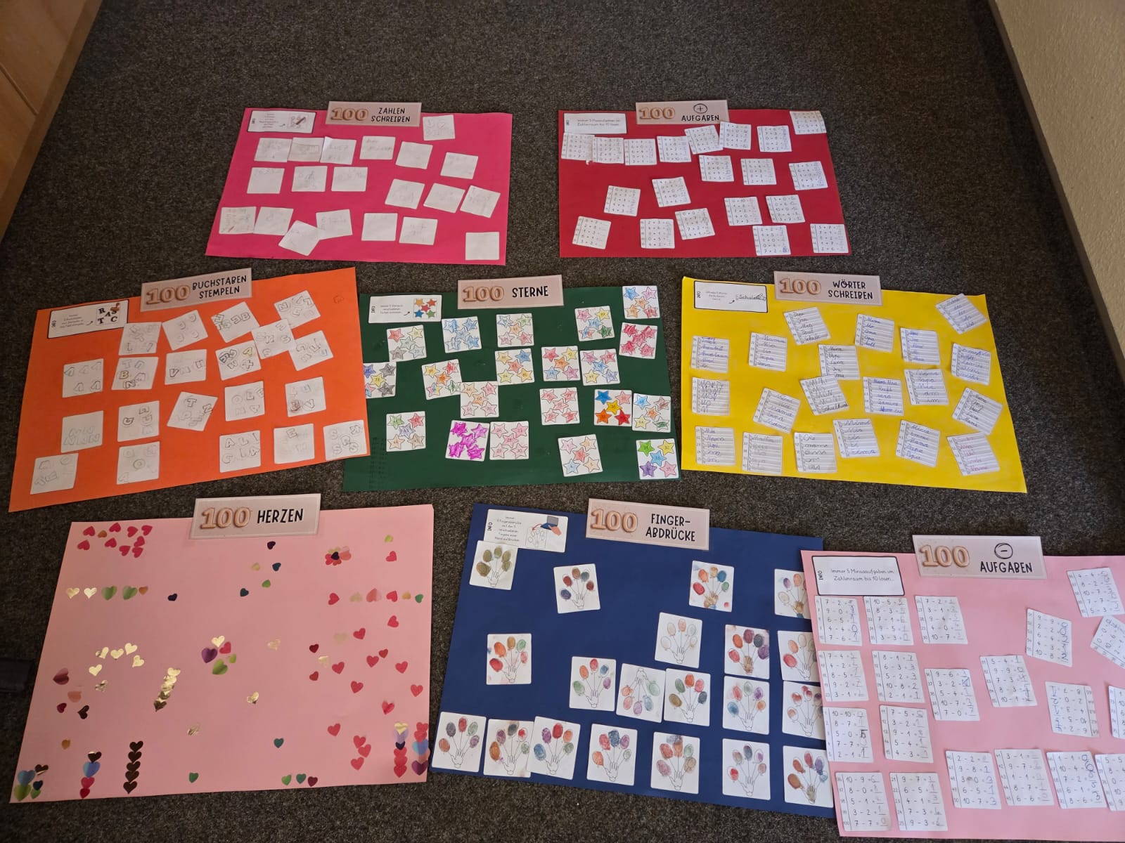 Die Kinder der 1. Klassen haben ihren 100. Schultag gefeiert – ein besonderer Meilenstein! An verschiedenen Stationen rund um die Zahl 100 konnten die Schülerinnen und Schüler zeigen, was sie schon alles gelernt haben. So wurden unter anderem 100 Plus- und 100 Minusaufgaben gelöst, 100 Wörter geschrieben, 100 Buchstaben gestempelt und 100 Fingerabdrücke und 100 Sterne gestaltet. Außerdem fädelten die Kinder 100 Perlen auf und zählten sie sorgfältig ab.
