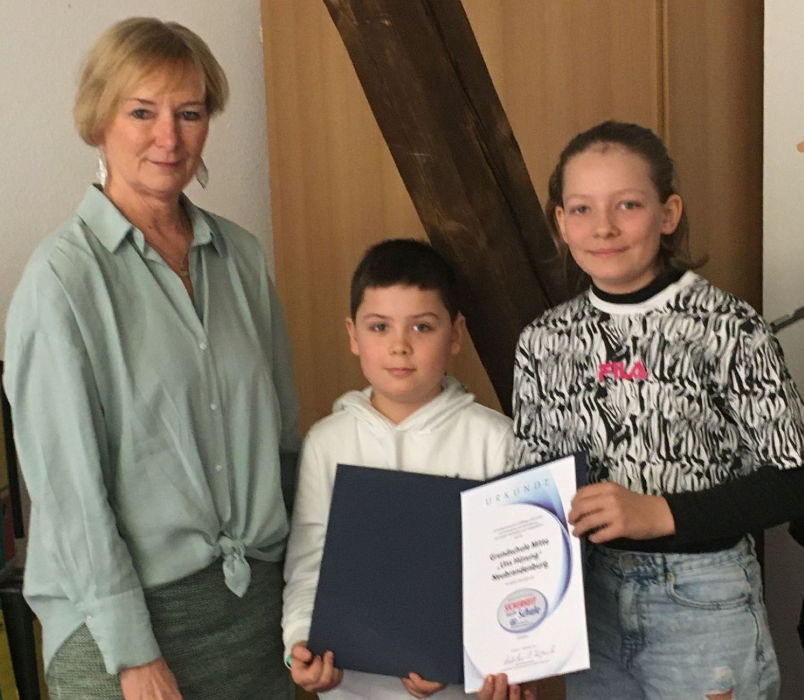 Erfolgreich verteidigte unsere Schule das Qualitätssiegel "Sicherheit macht Schule". Frau Rönnfeld vom Präventionsrat des Landkreises übergab die Anerkennungsurkunde an Schülerteamsprecher.