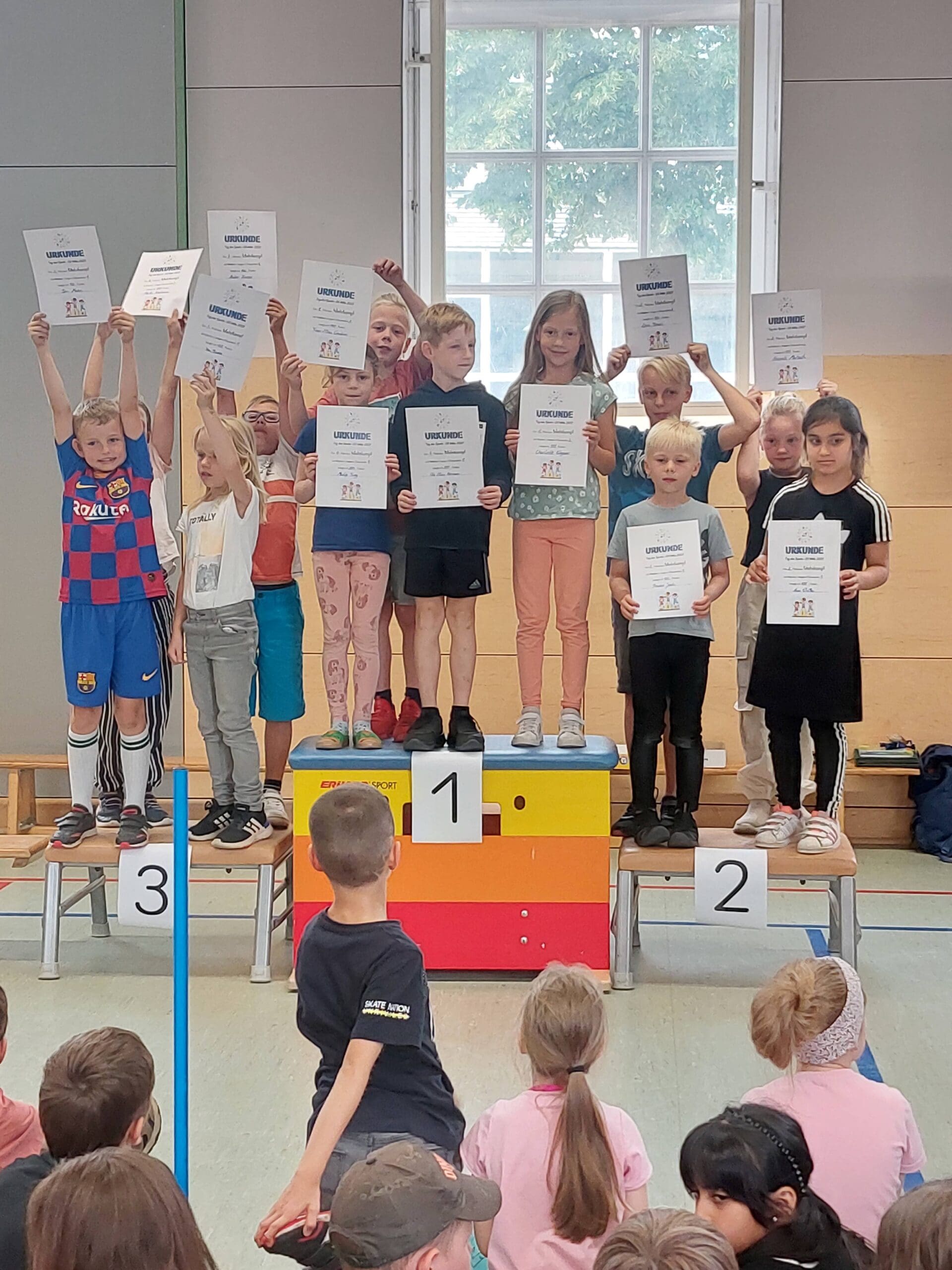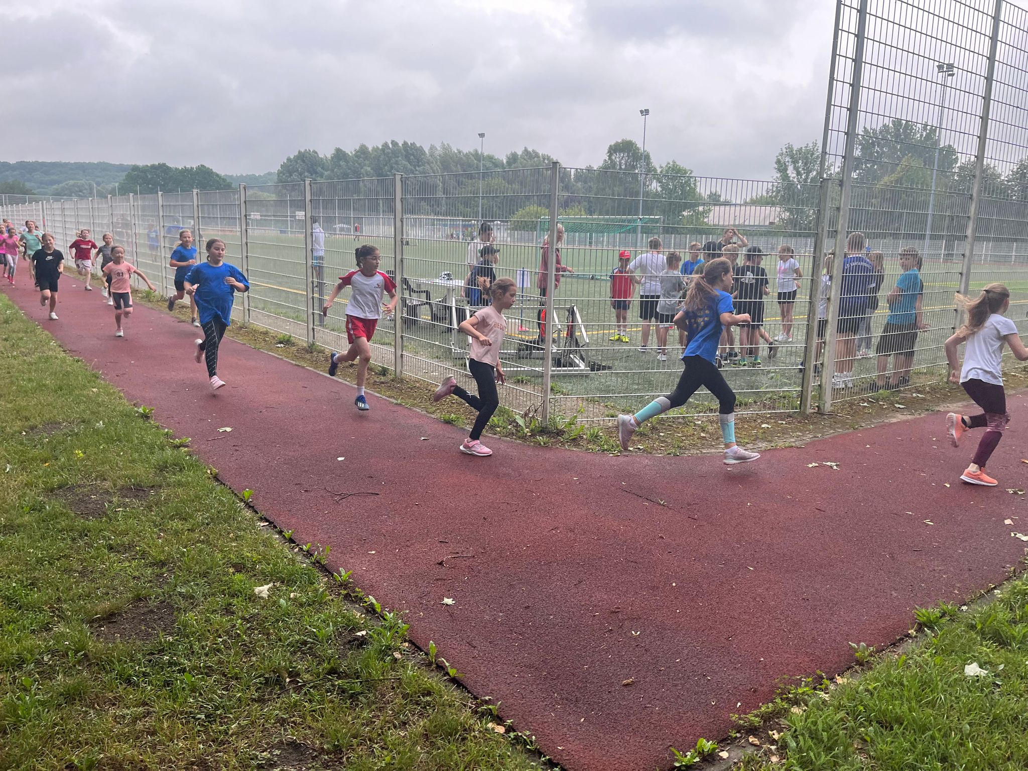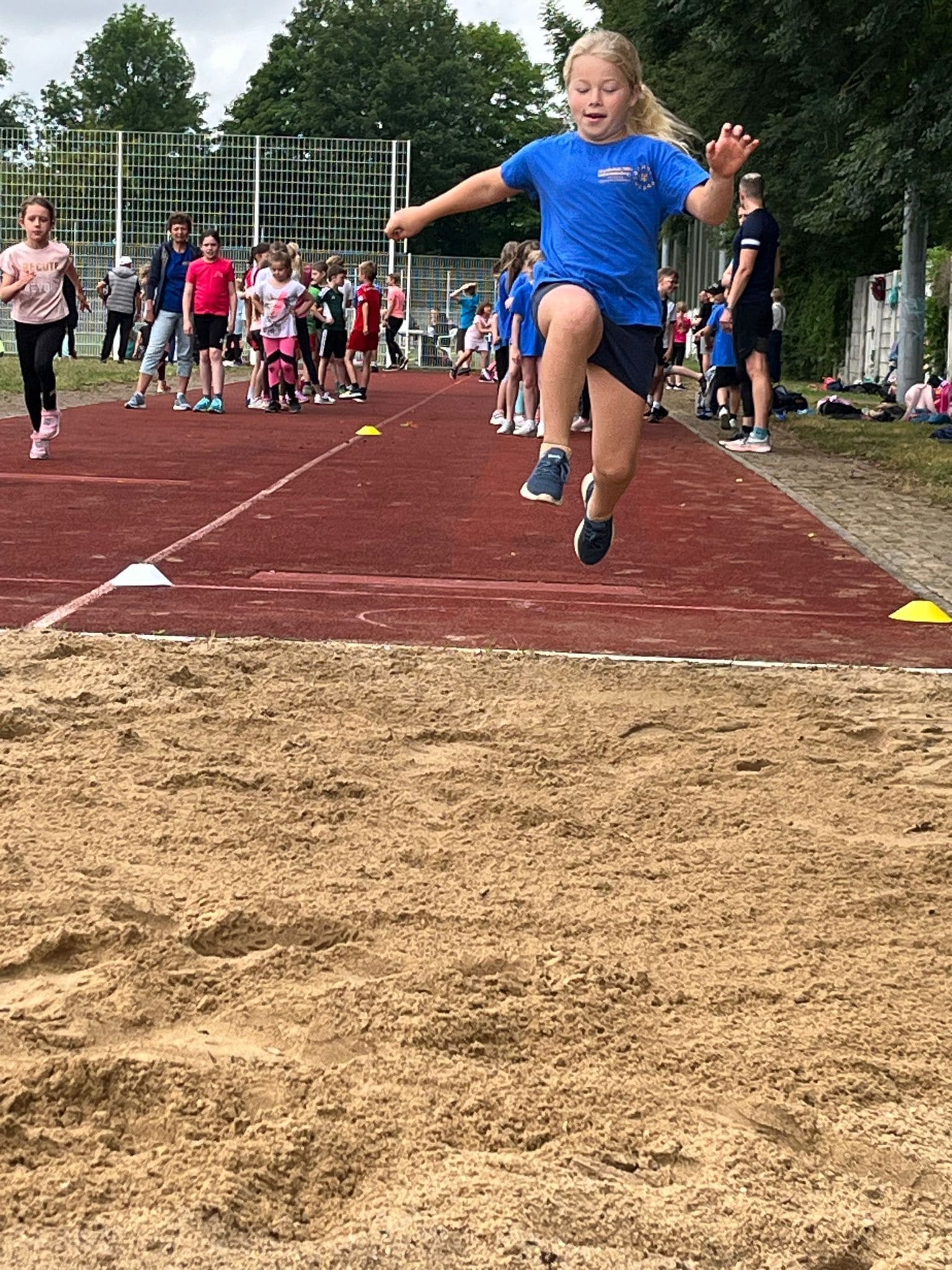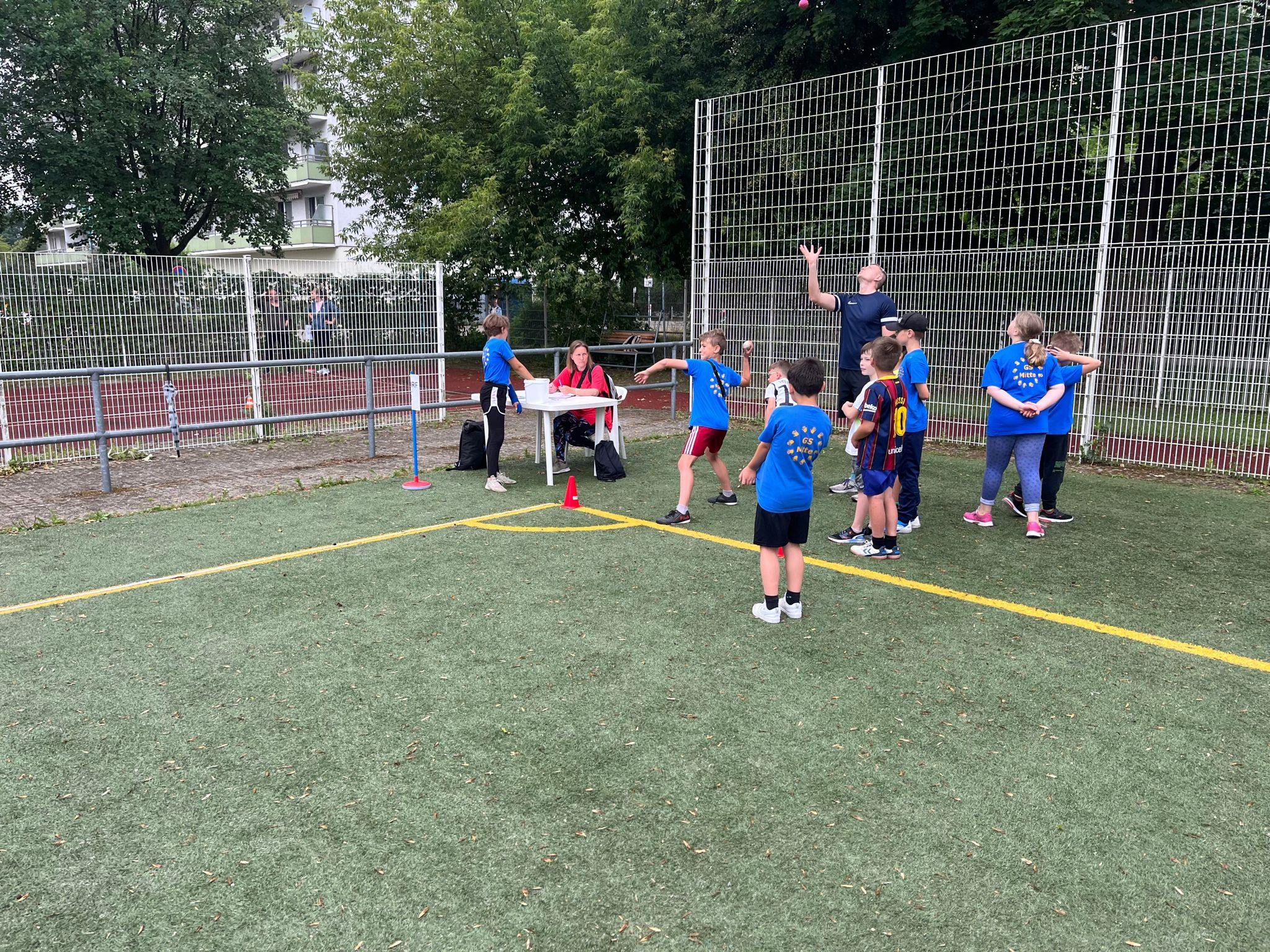 Ganz traditionell fand unser Schulsportfest in diesem Schuljahr wieder auf der Schulsportanlage statt. Wir kämpften um beste Ergebnisse im Weitsprung, beim Schlagballweitwurf, beim 50 m Sprint und beim 800 m Lauf. Alle waren eifrig dabei und zeigten viel Freude und Kampfgeist an den Wettkampfstätten. Viele Eltern, Großeltern und ältere Schüler halfen z.B. beim Messen, Stoppen, Harken als Kampfrichter oder im Rechenbüro. Herzlichen Dank dafür! Den Abschluss bildeten in allen Jahrgangsstufen die Kuchenstaffeln. Ein gelungener Tag für alle!