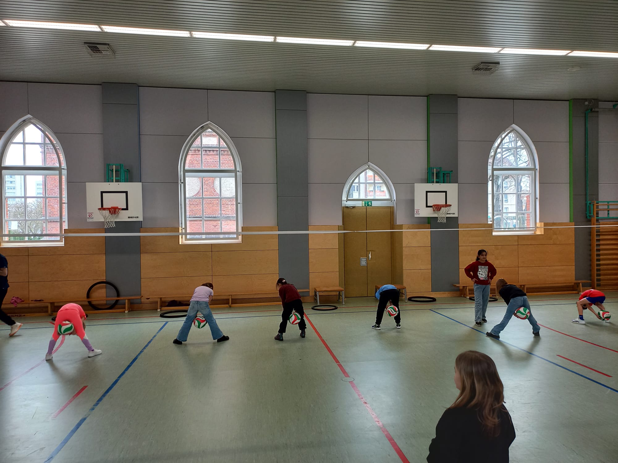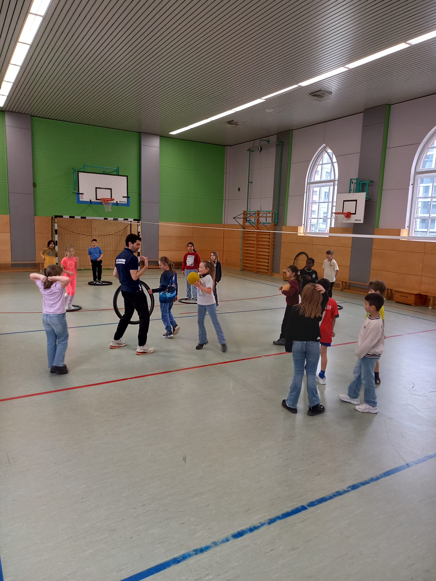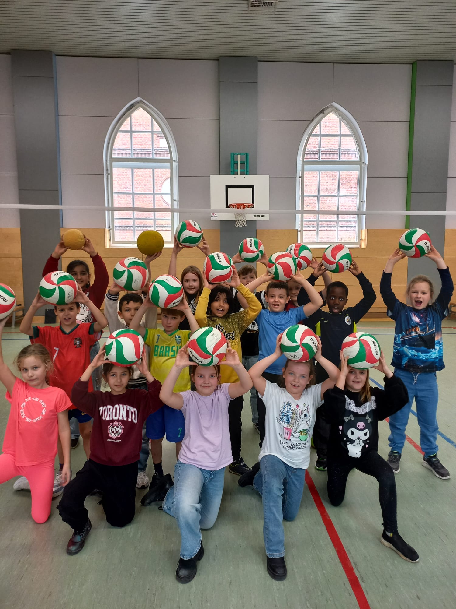 Mit viel Spaß und verschiedenen sportlichen Übungen werden unsere 2. und 3. Klassen an das Spielen am Netz, das Pritschen und Baggern während einer Volleyball Trainingsstunde mit Herrn Joveski  vom Volleyballverband herangeführt. Wer weiß? Vielleicht ist ein zukünftiger „Meister“ dabei? Wer Lust bekommen hat, schaut gern einmal beim Vereinstraining vorbei.